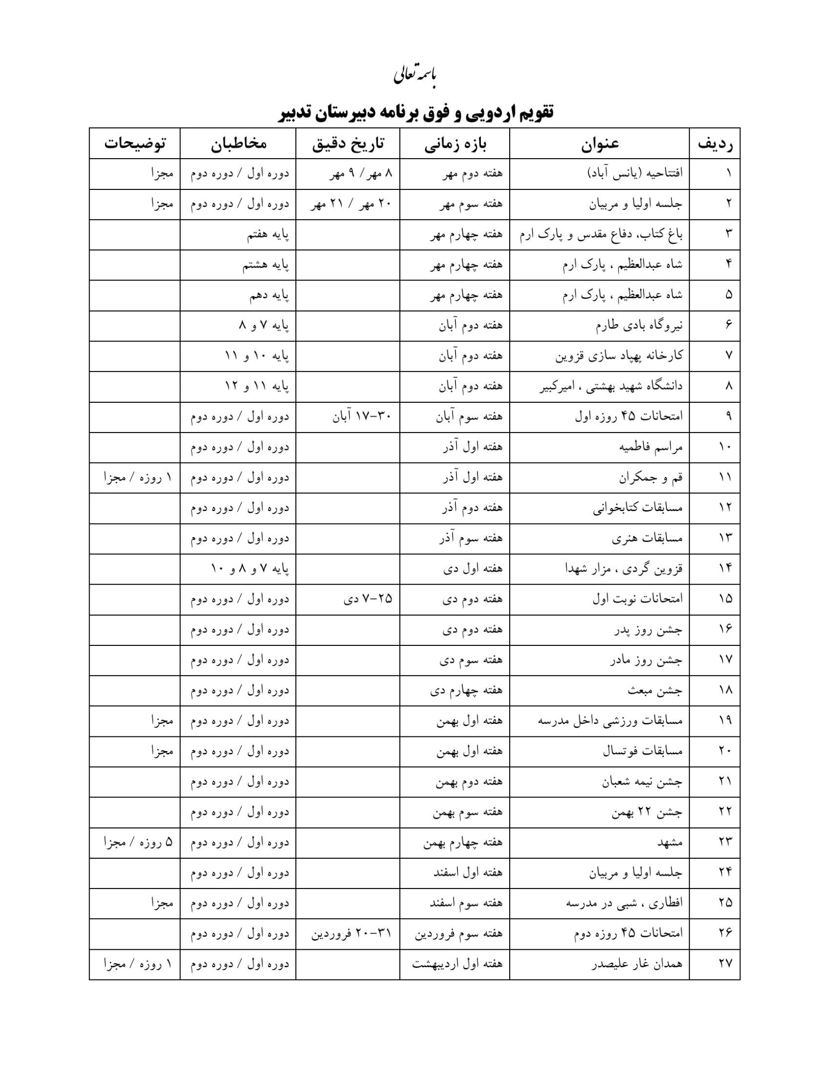 جدول مراسمات فوق برنامه و اردوهای سال تحصیلی 1404 را از لینک زیر می توانید دانلود کنید تمامی اردوها بصورت اختیاری میباشد و طبعتا تنها کسانی امکان ثبت نام خواهند داشت که شرایط لازم از نظر مدیریت دبیرستان کسب کرده باشند